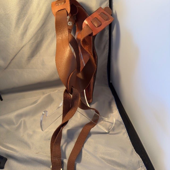 Made from light brown leather, this concealment holster features a harness attachment for a secure fit. The harness is a tad worse for wear in the its stretched a bit as are many of the other same holsters that I’ve seen for sale on eBay and other sites..